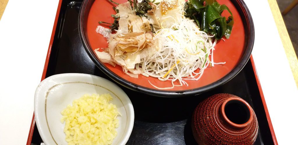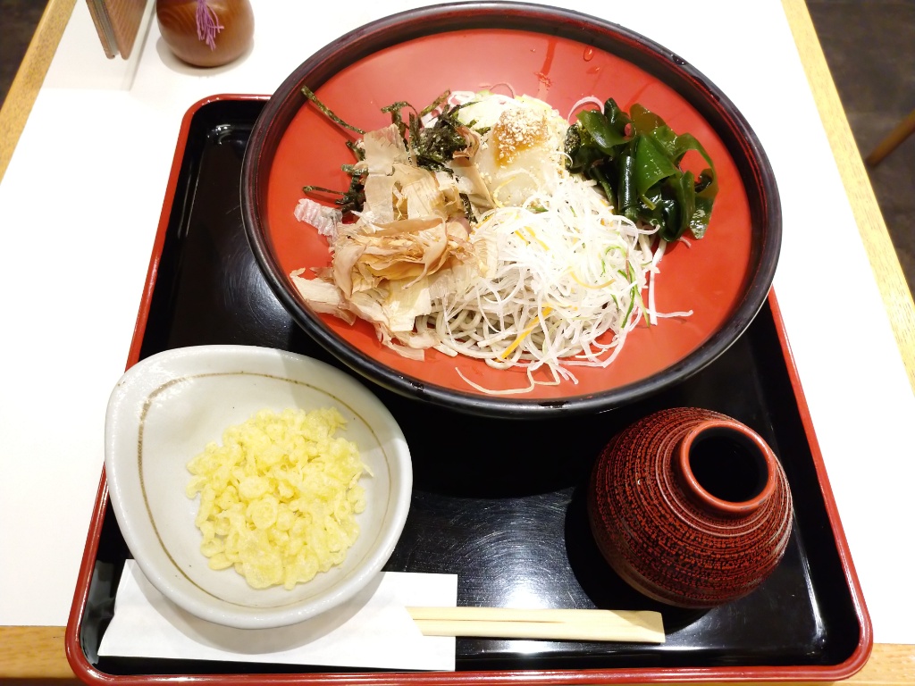 具だくさんのそばってどうなの?って最初はちょっと思ったけど、大根おろし、わかめ、鰹節などのさっぱり具材がそばとつゆと合わさって、良いハーモニーを生み出していました。揚げ玉がサクっとアクセントになっててよいです。