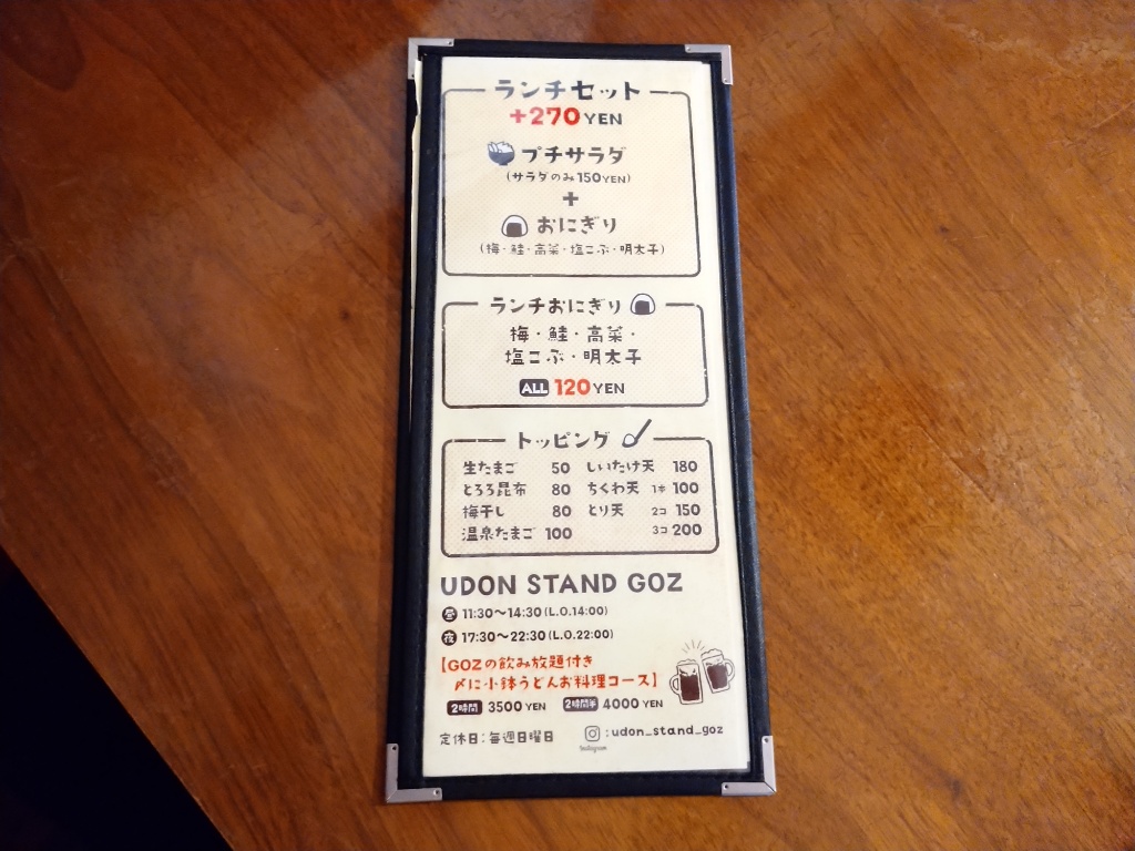 夜はうどん以外の料理メニューも充実しているようです。お酒と料理を楽しんだ後、〆にうどん、いいかもしれない。