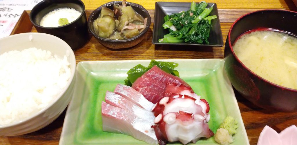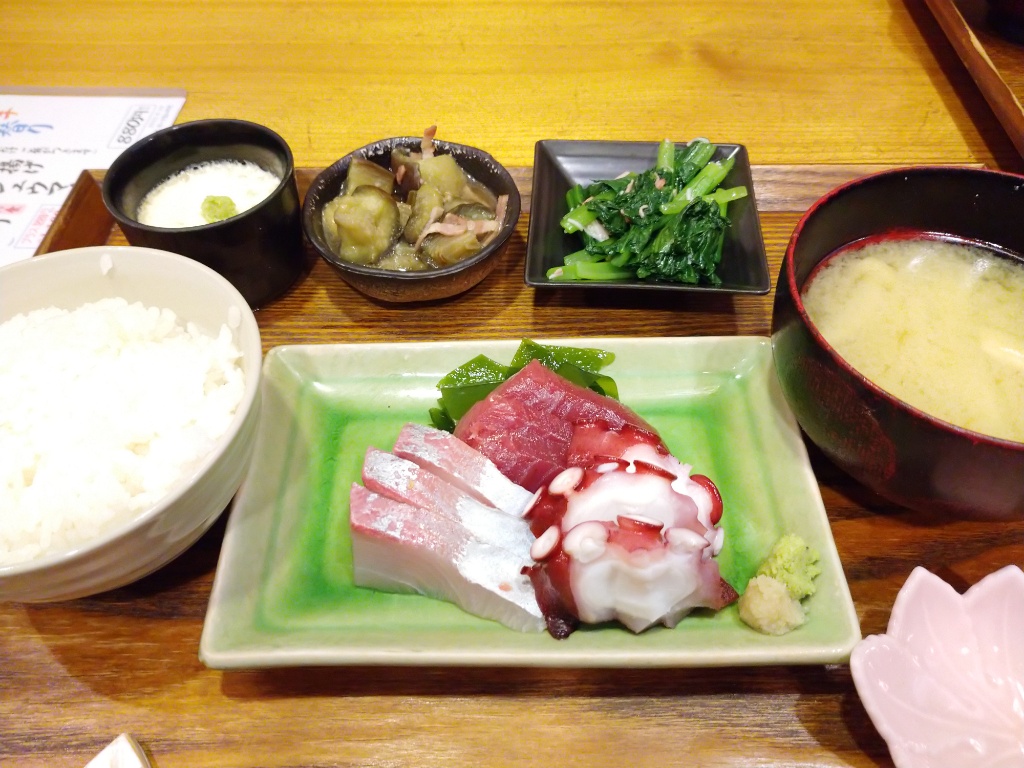 お刺身3点盛り。カツオ、カンパチ、タコ。どれもおいしくて気分が上がります!
