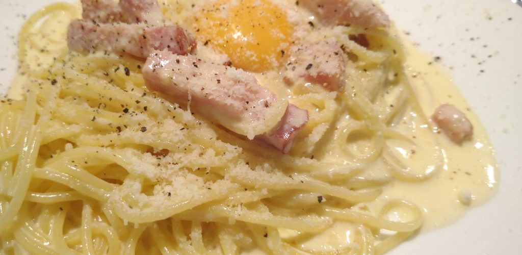 まろやか濃厚卵と厚切りベーコンのカルボナーラです。