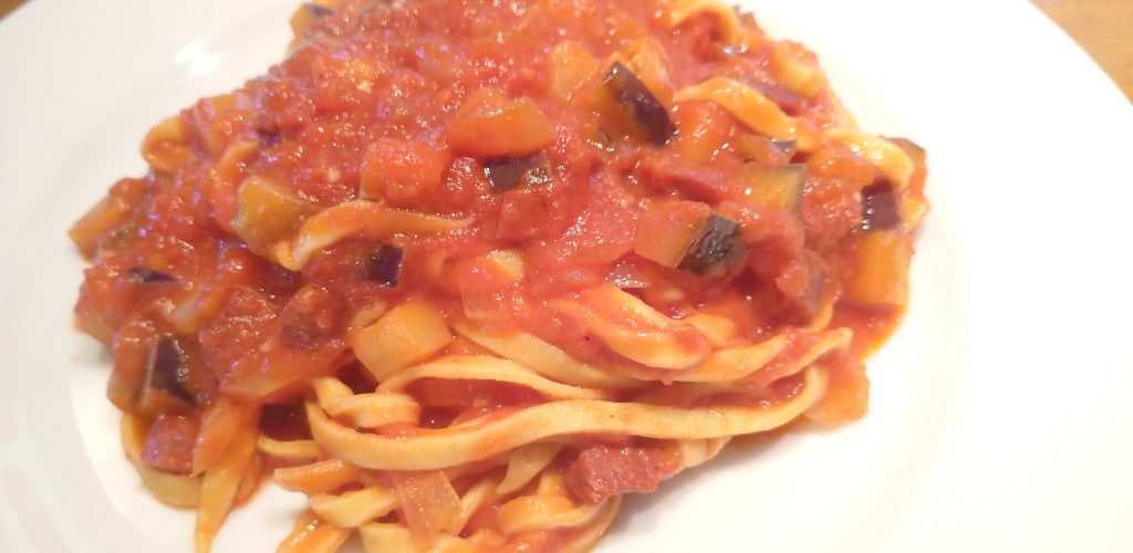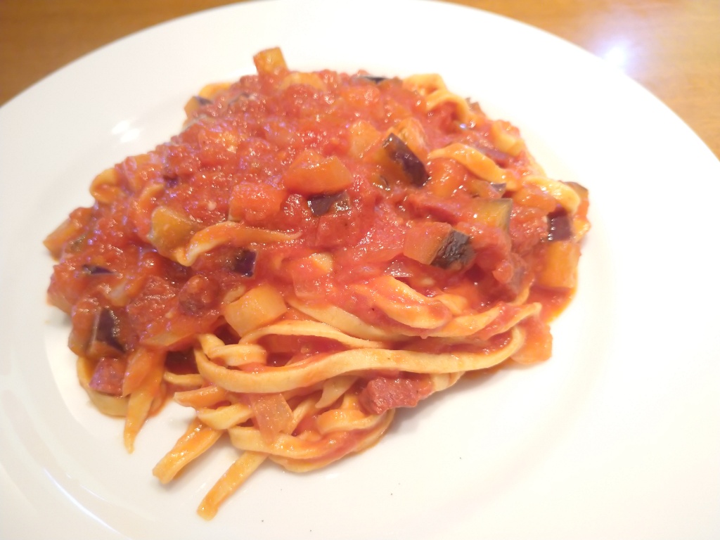 ピリ辛チョリソとなすのトマトソースです。パスタは乾麺と生パスタから選べます。