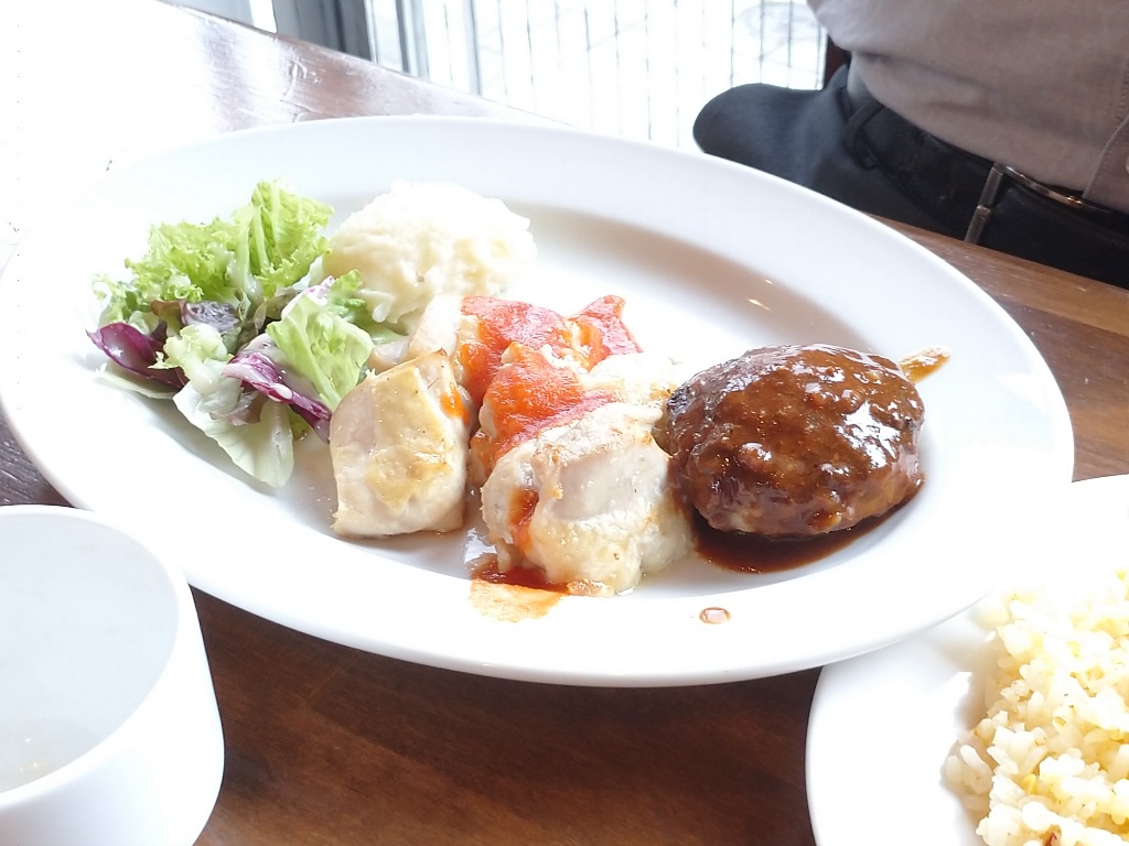Kさんが食べていた、若鶏のローストチキンとハンバーグ。