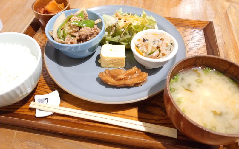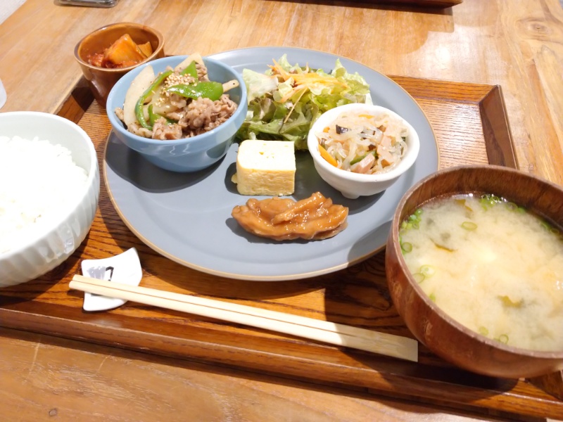 メインのおかずが、豚肉、レンコン、ピーマンを煮たもので、素材を生かした味付けでおいしかったです。